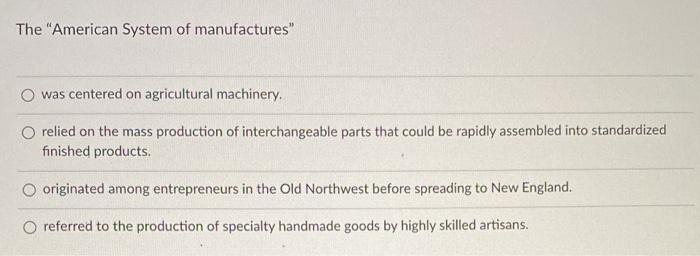 History of the American System of Manufacturing. AMERICAN SYSTEM OF MANUFACTURES. Eli Whitney Before 1798 Whitney was twenty-seven years old on March 14 1794 when he patented his invention of the cotton gin one of the first and most important inventions at the beginning of the age of industrializationHe had been born to a wealthy farming family in Massachusetts manufactured nails in his fathers shop during the final years of the American Revolution and graduated from. American System of Manufactures - Oxford Reference. Identify the statements that describe the american system of manufactures. The Development of Manufacturing Technology in the United States. The two notable features were extensive use of interchangeable parts and extensive use of mechanization to produce them which resulted in more efficient use of labor compared to hand methods.